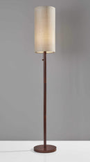 With a nod to Scandinavian and mid-century modern aesthetics, this floor lamp pairs a wooden pole with a walnut finish and a tall, double cylindrical shade. A wood ball on the pull-chain completes the statement. With its warmer fashion elements, this floor lamp makes a great addition to the den or more casual interiors. This lamp has a black clear and is smart outlet compatible. Bulb is not included.