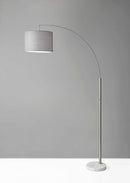 A smart and stylish way to light up a seating area, this Arc Lamp provides overhead lighting that can be controlled with an adjustable shade. Aside from functional assets, an brushed steel finish is paired with a white marble base to display striking style. An 100 Watt bulb shines beautifully through a grey tweed-like fabric shade. An on/off rotary switch is placed conveniently on the pole. This lamp has a clear cord and is smart outlet compatible. Bulbs are not included.