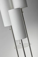 This floor lamp offers plenty of light and offers easy storage solutions within a decorative yet small footprint. Three satin steel poles secured in a round base each hold a white linen cylindrical shade. The poles also support two clear acrylic shelves for display or storage purposes. Three pull chain switches control each of the three 40 Watt incandescent or equivalent CFL bulbs offering varying light settings. This lamp has a clear cord and is smart outlet compatible. Bulbs are not included.
