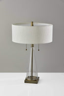 The perfect mix between classic and modern styling, this Table Lamp is the perfect choice for your workspace, nightstand or entry table. A sleek, tapered base is crafted with clear glass and accented with antique brass metals which enhances both design and stability. A textured off-white fabric shade reveals a stunning texture when lit. Double pull chains control two 60 Watt bulbs separately allowing for soft mood lighting as well as a powerful, ambient glow. Bulb s are not included.
