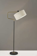 Clean lines and a modern, short drum shaped shade update the classic swing-arm style of this Floor Lamp. A mix of black and brass metals add mid-century flare. The white fabric shade has soft flecks of natural colors, revealing a unique and beautiful texture when lit. Swing the arm to focus light where you desire. Bulb is not included.