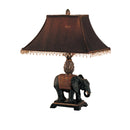 Classic design and stylish presentation merge, in this utterly ethereal glowing light of amazingness. This set of 2 table lamps features a polyresin base in the form of an elephant draped in a Persian rug with a wide fringed shade with a brown finish.
