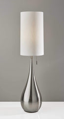 Featuring a sleek, teardrop shaped silhouette, this Table Lamp exudes elegance and contemporary style with its slim profile and minimalist focus. A tall, thin drum shade is made with a textured white fabric, softening the look. This stately table lamp stands 34.5" high making a strong presence in a room. Turn the lamp on and off with a simple pull chain switch. Bulb is not included.