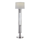 Lend an luminous touch to your living space with this stylish floor lamp offering a contemporary touch for your living space. The metal constructed silver finished stand features a glass cylinder having motion glitter with LED light and circular base. It comes with white drum shaped fabric shade and incorporates a rotary socket on lamp base. The glitter inside the cylinder reflects vibrant light making this lamp a glamourous table accent, perfect to be placed in your living room, bedroom.