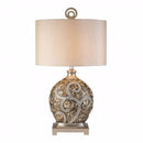 This beautiful table lamp is finished in champagne silver and adorned with vining crackled glass. It has a soft brightening glow that changes the ambiance of your place, while adding the perfect amount of style. Also, it has a doule loop ring on top.