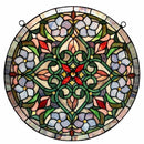 Featuring splendid colors and a beautifully balanced shape, this luxurious Tiffany stained glass window hanging allows you to enjoy the beauty stained glass provides without replacing your windows. Hanging hardware is included for your convenience. Add light like never before to your home decor with a Tiffany Lamp, a name trusted and admired in lighting and decorating design. Measure 20-inches in diameter 348-glass count and 13 cabochons Primary colors are blues, reds and greens Hanging hardware included Attention California residents: This product may contain lead, a chemical known to the State of California to cause cancer and birth defects or other reproductive Listed, ETL Listed, UL Listed