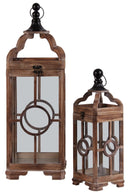 Create a warm inviting glow anywhere in your home with this wooden square lantern set. Wooden lantern is sturdily made with wood, metal and clear glass, can used for indoor and outdoor decoration. This set also features metal round finial on top with attached sturdy ring for easy hanging on wall sconce or outside on a hook. This lantern set features a circle design in center is perfect for a centerpiece, mantle, or any tabletop decoration. This wooden Lantern set comes in 2 different sizes allow you to create an instant interest to your home indoors and outdoor area.