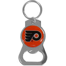 Hate searching for a bottle opener, get our Philadelphia Flyers bottle opener key chain and never have to search again! The high polish key chain features a bright team emblem.Officially licensed NHL product Licensee: Siskiyou Buckle. High polish chrome finish. Bottle opener feature. Standard split ring . Philadelphia Flyers domed emblem