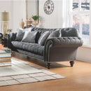 Experience a distinguished bliss of comfort with this contemporary style sofa. Its rolled arms provide for a convenient support for your elbows to relax onto. It incorporates a nail head trim and button tufted design for added visual interest. Upholstered in dark gray fabric, this sofa bears a wooden framework and comes with four pillows for added comfort. Other featured items in image are sold separately.