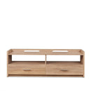 This TV stand has sturdy and robust wooden constructed frame in natural brown finish. It incorporates two open media compartments and two spacious drawers with bar handles at the bottom. It also feature two pre cut-out holes on the top shelf for better cord management. This TV stand would be a perfect addition for creating contemporary touch to your living space. TV stand with its minimalistic design would be perfect placing in your bedroom or living room.