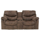Faux Leather Upholstered Metal Reclining Loveseat with Console and Split Back Details, Brown