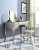 Adorn your dressing room with this classic vanity set. It is constructed using white finish engineered wood, veneer and comes with an armless stool featuring padded silver faux leather upholstery. The dressing table is supported by cabriole legs and five drawer storage attached to a knob handle. The lift top mirror on the adds to its construction while providing an efficient usage. Set this vanity and stool set in your bedroom for the make up application, jewelry, or as a small writing desk.