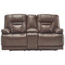 Make your favorite seating space even more inviting with this loveseat, wrapped in brown faux leather upholstery. Easily position the recliner, its adjustable headrest and lumbar support to your liking for maximum comfort. This power reclining loveseat?s enticing upholstery is enhanced with tufted back and has a sturdy corner blocked wooden frame with metal reinforced seats and forests. Also, the power touch reclining mechanism and two stainless steel cup holders extend your comfort level while providing a good space to your beverages.