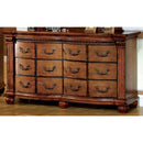 The drawers are burly with ample storage space to accommodate all of your make up essentails.This capacious dresser in antique tobacco oak finish, is elegantly carved and designed dresser brings a level of sophistication. French dovetail drawers with antique gold hardware add functionality and style to this beautiful bedroom piece. It does not include any featured product other than dresser. Dresser Dimensions: 22" x 68" x 36"