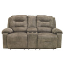 Polyester Upholstered Metal Reclining Loveseat with Storage Console and Cup Holders, Gray