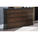 Add storage and style to your master suite with this rustic Double Drawer Dresser. Eight spacious drawers offer you a place to keep nearly your entire wardrobe organized so you never misplace your favorite sweater again. Each drawer is adorned with a custom metal pulls in a dark antique pewter finish to complement the burnished brown finish of the wood. Rivet banding accents are featured on the top edge of the dresser to complete the rustic aesthetic.
