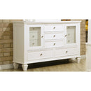 Add a classic style to your master bedroom with this Pre-eminent Traditional Dresser. Constructed of solid woods and finished in white the dresser will easily blend with your existing home Decor. The dresser has eleven drawers; five of which are exposed on the outside while six more are concealed behind two glass doors. Adorned to the door and drawer fronts are metal pull knobs. Its clean lines, simple molding, and square tapered feet create a sophisticated style. Dimensions: 18.5" x 61.25" x 40.25"