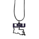 Get in on the trend! State themes are a trend that just keeps getting more popular and these necklaces take the state style and give it a sporty twist with a LSU Tigers added to the state outline charm. The come on a snake chain that is 22 inches long. Officially licensed College product Licensee: Siskiyou Buckle. Necklace comes with 2 charms. Metal outline state charm. Snake chain is 16 inches with 2 inch extender. High polish LSU Tigers charm