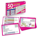 50 Hundreds Board Activities is a set of 50 double-sided activity cards for teaching math skills with the hundreds board. Topics include: skip counting, odd and even numbers, counting, less than and greater than, Ty numbers, teen numbers, addition, subtraction, reasoning, probability, number bonds, negative numbers, factors, multiples, mental arithmetic, multiplication, remainders, fractions, percentages and prime numbers. The front side provides teaching objectives, resources used and procedure. The other side provides visual examples. Math manipulatives used effectively throughout and presented in clear photography. Contains 50 double-sided activity cards and a contents card that can act as a check off list.