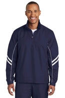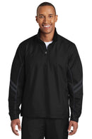 Wet windy days are no match for our water-repellent wind-resistant pullover. It features ventilating back vents and a side seam zipper for easy on/off.100% polyester ripstop with DWR finish 100% polyester mesh body lining polyester woven sleeve lining Cadet collar Tag-free label Rib knit inner collarExposed Vislon zipper Front zippered pockets Left side seam zipper Half elastic half self-fabric cuffs with hook and loop closures for comfort Port Pocket for easy embroidery access Piping and stripes details on front and back of sleeves Back vents with hook and loop closures Drawcord hem with toggles