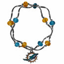 Officially licensed crystal bead bracelet with team colored crystal separated with chrome helix beads. The bracelet features a Miami Dolphins charm with exceptional detail.Officially licensed NFL product Licensee: Siskiyou Buckle. Double helix bracelet with crystal accents. Team colored crystals. Stretches to fit. Miami Dolphins team charm