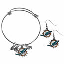 Our trendy Miami Dolphins charm bangle bracelet is now paired with our most popular dangle earrings for the perfect finish to any fan's outfit. The ajustable wire bracelet with 3 football themed charms and a beautiful team charm that matches the team charm on the earrings. The earrings have hypoallergenic, steel fishhook posts.Officially licensed NFL product Licensee: Siskiyou Buckle. Earrings come with hypoallergenic, steel fishhook posts. Adjustable wire bracelet with a football, helment and number 1 charm. Both popular jewelry pieces come with a fully cast metal team charm with enameled color. Ladies this on trend set Miami Dolphins will be the pride of any fan's collection