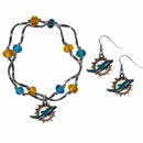 Ladies are you looking to make a fan statement? Check out this eye-catching Miami Dolphins set that includes a delicate bead bracelet and matching dangle earrings. The bracelet has 2 entwined stretch cords with helix beads separated by team colored crystal beads and fully cast metal team charms that match the team charms on the earrings. The earrings features hypoallergenic, steel fishhook posts. This designer inspired jewelry set will be the talk of the game!Officially licensed NFL product Licensee: Siskiyou Buckle. Earrings come with hypoallergenic, steel fishhook posts. Fashionable helix and crystal bead bracelet. Both trendy jewelry pieces come with a fully cast metal team charm with enameled color. Beauty and sports meet in this Miami Dolphins jewelry set
