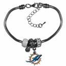 This must-have bracelet is fashioned with the trendy euro style beads and an eye catching team charm to create a designer inspired Miami Dolphins bead bracelet. This is a true statement piece with 4 euro beads, a rhinestone accent and stylish team charm beaded onto a 7.5 inch snake chain with a 2 inch extender for an adjustable fit. This contemporary look is perfect for game day but chic enough for everyday. Officially licensed NFL product Licensee: Siskiyou Buckle. Wildly popular euro bead style with a sporty twist, includes 4 euro beads, rhinestone accent and team charm. The bold design comes on a high-quality 7.5 inch snake chain bracelet with 2 inch extender for an adjustable fit. The sassy team charm has expertly enameled team colors and carved detail. This is the perfect gift for any fashion-forward female Miami Dolphins fan