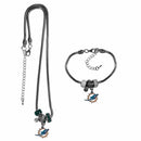 This must-have Miami Dolphins look features the wildly popular euro bead style teamed with eye catching team charms. This set comes with a fashionable snake chain bracelet and 18 inch necklace both featuring a variety of team colored euro beads and rhinestone beads for classy look that outshines the average fan jewelry. This high quality set is great for game-day but a fan's going to want to show off this set everyday!Officially licensed NFL product Licensee: Siskiyou Buckle. Featuring the wildly popular euro beads on an 18 inch necklace and matching bracelet. High quality jewelry at a great price. On trend look paired with a sporty twist, featuring a fully cast metal team charm with enameled details. Miami Dolphins ladies these necklace and bracelet sets are the perfect game-day outfit accessory