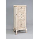 Creatively organize all your jewelry collection with our antique jewelry armoire. This armoire offers the ladies freedom to keep safe their expensive accessories. It features five storage drawers, two bottom doors with hook and a hidden mirror on the top. The multi-faceted wooden top rests on wooden fluted legs with overall construction finished in charming antique white. This will perfectly anchor any room decor with enduring look and classic style.