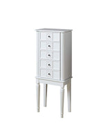 Creatively organize all your jewelry collection with our luxurious jewelry armoire. This armoire offers the ladies freedom to showcase or keep safe their expensive accessories. It features five storage drawers, two side doors with hook and a raised mirror on the top. We ensure each storage drawer is finely velvet outlined. The multi-faceted wooden top rests on wooden fluted legs with overall construction finished in charming white. This will perfectly anchor any room decor with enduring look and classic style.