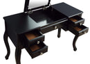 Create an electrifying ambience in any room with this exquisite vanity collection. Each piece of this enchanting masterpiece is delicately sculpted from refined wood and finished with attractive veneer. The vanity comes with a lift-top mirror in a classic rectangular shape. This is followed by a complementary armless rectangular stool, neatly upholstered in bone velvet fabric. It is also furnished with five drawers which serve as a sleek storage spot for personal effects. Both the vanity and its matching stool stand on a gracefully curved cabriolet legs; highly indicative of poise and regality. This vanity collection can be used for grooming or make-up application. Hang jewelries and mementos on it or better still use it as a writing desk. It is available in the dimension of 18 by 43 by 47 inches.