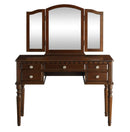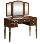 Create an electrifying ambience in any room with this exquisite vanity collection. Each piece of this enchanting masterpiece is delicately sculpted from refined wood and finished with attractive veneer. The vanity comes with a three-panel hinged mirror sporting a rare design along with a curved rectangular frame. This is followed by a complementary armless rectangular stool, neatly upholstered in lush tan velvet fabric. It is also furnished with five drawers which serve as a sleek storage spot for personal effects. Both the vanity and its matching stool stand on a gracefully turned legs; highly indicative of poise and regality. This vanity collection can be used for grooming or make-up application. Hang jewelries and mementos on it or better still use it as a writing desk. It is available in the dimension of 19 by 43 by 54 inches.