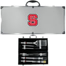 Our 8 pc BBQ set includes a spatula with knife edge, grill fork, tongs, basting brush and 4 skewers. The tools are approximately 19 inch long and have sturdy stainless steel handles. The aluminum carrying case features a metal carved N. Carolina St. Wolfpackemblem with enameled finish.Officially licensed College product Licensee: Siskiyou Buckle. Heavy duty 420 grade stainless steel tools. 8 pc set includes: spatula, fork, tongs, basting brush and 4 skewers. This quality set comes in a metal team carrying case. N. Carolina St. Wolfpack emblems on the tools and large emblem on the case