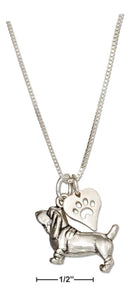 Sterling Silver 18" Basset Hound Necklace With Dog Paw Print Heart Pendant