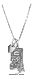 Sterling Silver 18" Mississippi State Pendant Necklace With Heart Charm