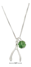 Sterling Silver Necklace: 18" Wishbone Necklace With Four Leaf Clover Green Crystal Pendant