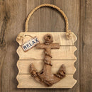 The plaque is fashioned from a piece of wood with rough jagged edges offering a real driftwood look. In the center is a rusty-look anchor.