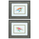 A set of two watercolor styled prints that are double matted and framed under glass with a complimenting distressed wood frame. This set is sure to give any room a seaside charm. They come ready to hang and are proudly hand assembled in the USA!