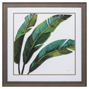 This vibrant tropical leaves print is double matted and framed under glass with a complimenting distressed wood tone molding. This piece comes ready to hang and is hand assembled in the USA!