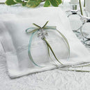 The Celtic Charm Ring Pillow, made of Irish inspired white linen, will carry your rings in style. The Celtic Trinity Knot in silver holds a green ribbon for the rings, or ring pouches, to be tied to.