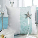 A band of embroidered seashells with starfish detail on a beautiful aqua blue linen look fabric, framed with a white linen look satin make this ring pillow truly stunning. Top it off with a silver starfish and you have a breath taking addition to your wedding.