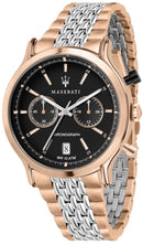 Rose Gold Tone Stainless Steel Case Two Tone Stainless Steel Bracelet Quartz Movement Caliber: VK64 Mineral Crystal Black Dial Analog Display Chronograph Function 12/24 Hours Display Date Display Screw Down Crown Solid Case Back Deployment Clasp 100M Water Resistance Approximate Case Diameter: 42mm Approximate Case Thickness: 9.7mm