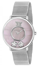 Stainless Steel Case Stainless Steel Mesh Bracelet Quartz Movement Caliber: VJ20 Mineral Crystal Pink Mother Of Pearl Dial Analog Display Diamond Accents Solid Case Back Deployment Clasp 50M Water Resistance Approximate Case Diameter: 34mm Approximate Case Thickness: 8.5mm