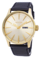 Gold Tone Stainless Steel Case Leather Strap Quartz Movement Mineral Crystal Gold Dial Analog Display Printed Seconds Track Custom Molded Hands Day And Date Display Screw Down Crown Solid Case Back Buckle Clasp 100M Water Resistance Approximate Case Diameter: 42mm Approximate Case Thickness: 11mm