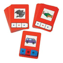 Set of 24 laminated cards with picture and color cues for children to build three-letter words with Unifix Letter Cubes CVC sets. Color illustrations of common objects and animals.
