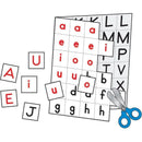 12 student sets of cut-apart letter cards. Four of each vowel and two of each consonant per set, with lowercase letters on one side and uppercase on the other.