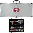 This is the ultimate San Francisco 49ers tailgate accessory! The high quality, 420 grade stainless steel tools are durable and well-made enough to make even the pickiest grill master smile. This complete grill accessory kit includes; 4 skewers, spatula with bottle opener and serrated knife edge, basting brush, tongs and a fork. The 18 inch metal carrying case is perfect for great outdoor use making grilling an ease while camping, tailgating or while having a game day party on your patio. The tools are 17 inches long and feature vivid team graphics. The metal case features a large team emblem with exceptional detail. This high-end men's gift is sure to be a hit as a present on Father's Day or Christmas.Officially licensed NFL product Licensee: Siskiyou Buckle. 420 grade stainless steel BBQ set for outdoor events. Grill set includes: 4 skewers, spatula with bottle opener and serrated edge, fork and tongs. The high-quality tools make this set the perfect men's gift for Father's Day or Christmas. Each tool features vivid San Francisco 49ers graphics and the case features a 4 inch team logo