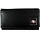 This genuine leather women's pocketbook features 9 credit card slots, a windowed ID slot, spacious front pocket, inner pocket and zippered coin pocket. The front of the pocketbook has a hand painted metal square with the San Francisco 49ers primary logo. Officially licensed NFL product Licensee: Siskiyou Buckle. Genuine fine grain leather wallet. 6 credit card slots and windowed ID slot. Large zippered pocket. Metal San Francisco 49ers emblem with enameled team colors