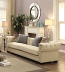 With the newest modern design, this sofa set offers a cozy and elegant look. This beautiful piece features a kiln dried solid wood frame, hand-hammered shoe nail heads, feather down cushions and eight-way hand-tied spring suspension to provide maximum support and comfort. The smooth lines of this classic piece are accented by gorgeous hand-applied button tufting on the rear cushion, arms and front.